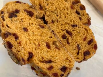 A cozy blend of pumpkin puree and tart cranberries baked into a naturally fermented loaf. Slightly sweet, full of flavor, and wonderfully soft- it's a taste of fall you'll want all year long. Baked during October and November