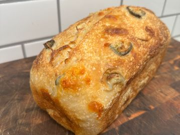 A bakery favorite with a little kick. Sharp cheddar melts into pockets of tangy sourdough while fresh jalapenos bring a touch of heat. Delicious on it's own or as the base for the best grilled cheese you'll ever have.